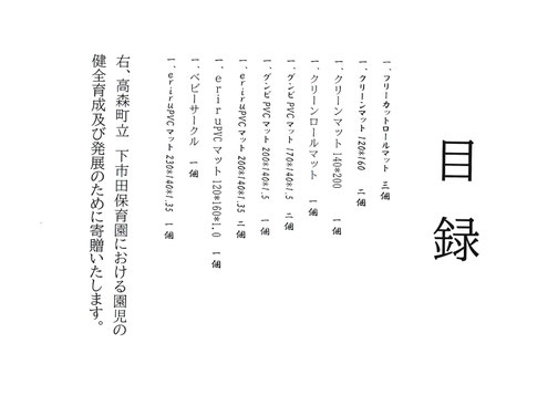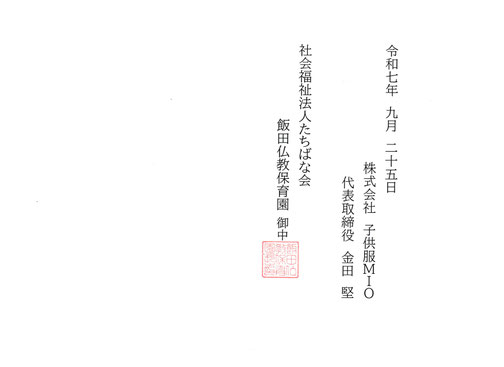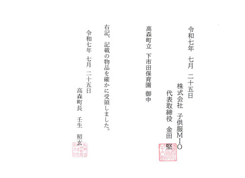 (株)子供服MIOでは、社会貢献活動の一環として、長野県飯田・下伊那地域の保育園などの施設様へ寄付・寄贈をさせていただいております。